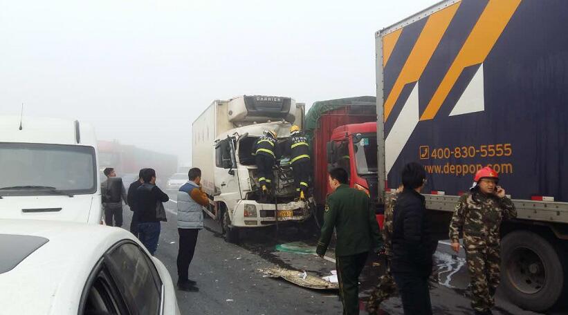 據(jù)現(xiàn)場郭先生描述:大概有4輛貨車,1輛中巴車,4輛私家車連環(huán)追尾,他就在這幾輛事故車后方,當時受大霧影響,能見度50米左右,前方堵車,結果這幾輛車都沒剎住,直接相繼撞上了,郭先生說“幸虧當時我車速不算快,及時把車剎住,不然前方就是一輛貨車,撞上去的話后果不堪設想,現(xiàn)在我的手都是抖的,太恐怖了”。