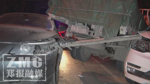 鄭報融媒記者看到,肇事寶馬車為懸掛豫A號牌的灰色5系轎車,該車車頭左側(cè)撞擊卡車后保險杠后受損嚴重,受傷部位由車身延伸至駕駛艙,鐵質(zhì)車身被劃開一道約20厘米寬的口子,駕駛位上方車頂部位則卡在了卡車車尾之下。