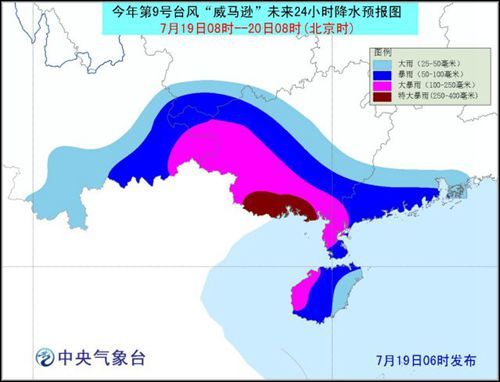 19日08時(shí)至20日08時(shí),南海西北部、瓊州海峽、北部灣以及海南沿海、廣東西部沿海、廣西南部及沿海將有7-9級(jí)大風(fēng),其中北部灣北部、廣東雷州半島西部沿海、廣西沿海將有10-12級(jí)大風(fēng),臺(tái)風(fēng)中心經(jīng)過(guò)的附近海域或地區(qū)的風(fēng)力有13-15級(jí),陣風(fēng)可達(dá)16-17級(jí);海南大部、廣東西南部、廣西南部和西部、云南東南部等地有暴雨或大暴雨,其中,廣西南部等地的局部地區(qū)有特大暴雨(250-400毫米)。
