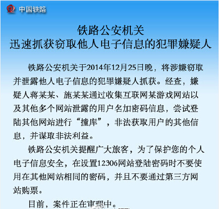 10、涉嫌竊取12306網(wǎng)站用戶信息者被抓獲