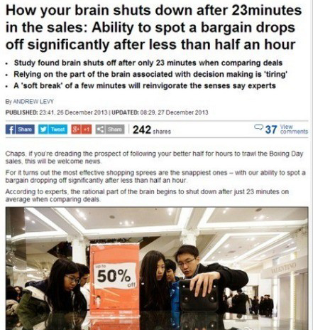 研究指出,一般人在購物23分鐘后,大腦理性估價的能力就會下降,逐漸失去理智。只要一見特價,就會立即進(jìn)入失心瘋狀態(tài)亂買東西!解決方法是可以每隔半小時停下來喝杯咖啡。。。