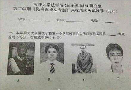 南開(kāi)大學(xué)法學(xué)院某科目的期末試卷被學(xué)生上傳,瞬間引爆學(xué)生圈。同學(xué)們表示:“內(nèi)傷了”“臉盲怎么辦”“想想真的很有道理?。 薄灿型瑢W(xué)吐槽,“老師您用的是大學(xué)時(shí)候的證件照,現(xiàn)在不長(zhǎng)這樣了…”這還真是一個(gè)刷臉的時(shí)代啊