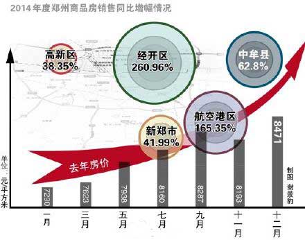 鄭州去年12月份房價達到8471元/平方米,達到歷史最高水平,相比于去年年底漲了1181元。即便如此,經(jīng)開區(qū)和航空港區(qū)商品房銷售翻倍。隨著拆遷的進行,租房價格也一路走高,商鋪房租上漲10%,住宅房租漲幅達15%。