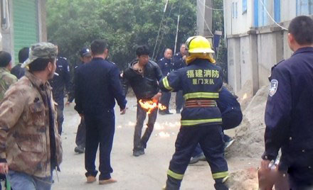 1月26日,廈門同安行政執(zhí)法局西柯城管中隊在拆除違建過程中,被違建者潑汽油瓶,造成多名執(zhí)法人員燒傷。違建者柯某的妻子爬上違法建筑的二樓,點燃汽油票向執(zhí)法人員投擲,并搬出兩罐煤氣罐,同時在自己身上澆灌可燃液體并手持打火機,表示要同歸于盡,柯某到場后撿起正在燃燒的液體瓶向城管中隊長撲去,造成其和另一名隊員燒傷。因妨害公務(wù),柯某昨已被刑拘。