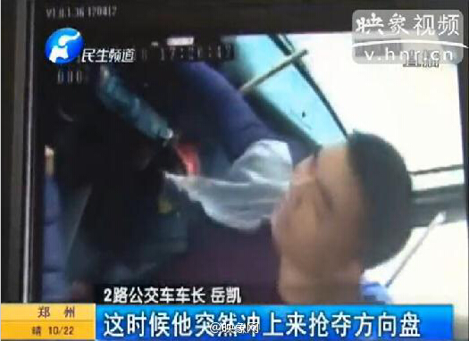 監(jiān)控顯示,鄭州2路公交車(chē)正常行駛中,突然一男子沖上來(lái)猛拉方向盤(pán),并與公交車(chē)長(zhǎng)廝打在一起。男子將車(chē)長(zhǎng)狠狠地壓在方向盤(pán)上,無(wú)法動(dòng)彈。而其動(dòng)手的原因竟是因?yàn)樽^(guò)了站,車(chē)長(zhǎng)沒(méi)有及時(shí)給他開(kāi)門(mén)。事后,民警對(duì)此事進(jìn)行了調(diào)解。