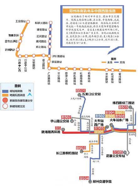 鄭州市有軌電車中原西路線路起點(diǎn)為地鐵一號(hào)線西流湖站,終點(diǎn)為滎密路與科學(xué)大道交叉口。另設(shè)支1線連接鄭州西三環(huán),支2線滎陽四方車輛廠至主線。主要沿鄭上路、樂山路、中原西路、光武路、老國道310及滎密路敷設(shè)。