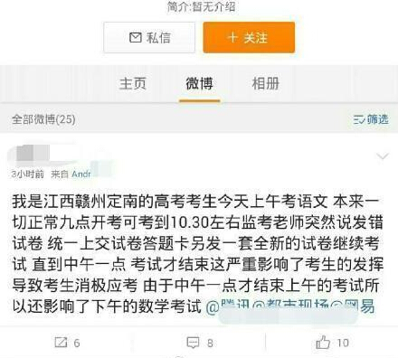 6月7日晚,有多位網(wǎng)友反映,江西省贛州市定南縣有4個(gè)高考考場發(fā)錯(cuò)試卷。定南縣教體局證實(shí),當(dāng)天的語文考試,確實(shí)有4個(gè)考場發(fā)錯(cuò)了試卷,當(dāng)?shù)亟逃块T調(diào)取備用試卷并將考試時(shí)間延后,語文科目于下午一點(diǎn)鐘考試結(jié)束。目前,事件原因正在調(diào)查中。