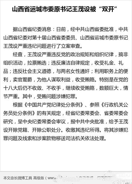 15、山西省運(yùn)城市委原書記王茂設(shè)被“雙開”