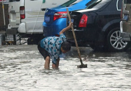 昨天下午,鄭州突降大雨??图悸分卸?,有200多米道路被雨水淹沒,積水最深處已經(jīng)到腿肚。一位大媽冒著暴雨在積水中清理下水口附近的垃圾,試圖讓水流得更快一些。