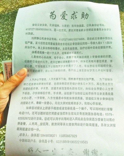 近日,有網(wǎng)友發(fā)微博稱,鄭州火車站候車廳,有個自稱徐保磊的人向旅客挨個散發(fā)傳單,稱妻子因出車禍住院無錢治療,向旅客乞討求助。經(jīng)多方調(diào)查:當(dāng)事人已出院兩年多,發(fā)傳單的不是徐保磊本人。大家不要上當(dāng)??!