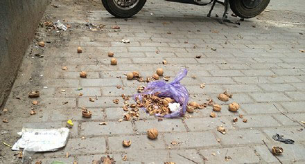 8月26日,鄭州互助路某家屬院忽然天降一包核桃,險些砸中買菜回來的王女士。接到王女士求助后,巡防隊員急忙上樓查看高空拋核桃的居民,沒有一家開門說明情況。據(jù)了解,該小區(qū)之前也有居民反映高空拋物現(xiàn)象。