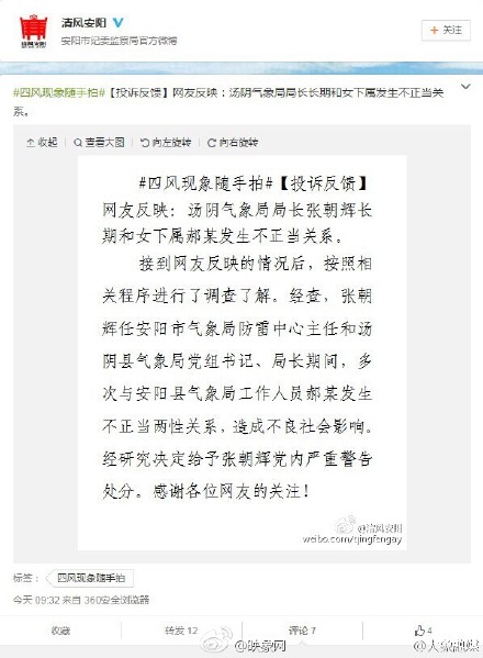 以往不少"性丑聞"官員都被查出貪腐問題。不妨順藤摸瓜,查一查張朝輝是否存在其他問題,給民眾一個交代。同時,張朝輝今年初剛被任命為湯陰縣氣象局長,尚在1年試用期內(nèi)。既然出了如此影響惡劣的丑聞,組織上有必要對其任職資格和條件,重新進(jìn)行評估。