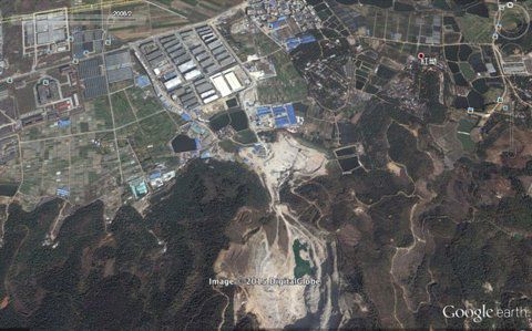 圖片來(lái)自谷歌衛(wèi)星圖。2008年2月,采石場(chǎng)內(nèi)碎石遍布白色一片,坑底大量積水已形成了一個(gè)小型水庫(kù)。