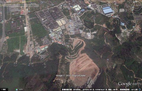 圖片來(lái)自谷歌衛(wèi)星圖。2015年9月,采石場(chǎng)已成為渣土填埋場(chǎng),此前裸露在外的白色碎石被紅黃色的泥土所掩蓋。