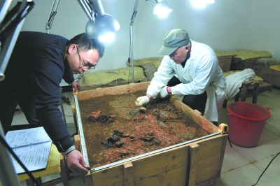 1月14日,?;韬钅沟目脊艑嶒炇覂龋ぷ魅藛T正為一匹提取的偶車馬做清理和記錄。郭 晶 攝