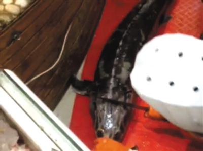 在海鮮市場(chǎng)海鮮廳另一攤位,擺放著一條約30斤的鱘鰉魚。攤位女老板告訴記者,死了的鱘鰉魚16元/斤,活的、重量在四五十斤的鱘鰉魚售價(jià)22元/斤。