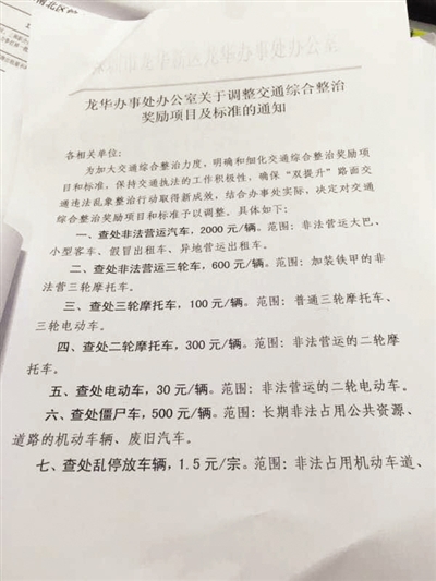 記者在一份由深圳龍華新區(qū)龍華辦事處辦公室出具的《關(guān)于調(diào)整交通綜合整治獎(jiǎng)勵(lì)項(xiàng)目及標(biāo)準(zhǔn)的通知》的文件中發(fā)現(xiàn),為加大交通綜合整治力度,明確和細(xì)化交通綜合整治獎(jiǎng)勵(lì)項(xiàng)目和標(biāo)準(zhǔn),保持交通執(zhí)法的工作積極性,辦事處決定對(duì)交通綜合整治獎(jiǎng)勵(lì)項(xiàng)目和標(biāo)準(zhǔn)予以調(diào)整,其中加裝鐵甲的非法營(yíng)運(yùn)三輪車每查處一輛獎(jiǎng)勵(lì)600元,普通三輪摩托車、三輪電動(dòng)車每輛獎(jiǎng)勵(lì)100元,對(duì)無(wú)證駕駛、妨礙執(zhí)法當(dāng)事人實(shí)施行政拘留的,拘留一人獎(jiǎng)勵(lì)500元。