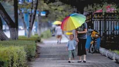 昨日下午3點(diǎn)左右,長春上空開始下起小雨。南湖大路上一位母親剛剛接到幼兒園放學(xué)的孩子 新文化記者 郭亮 攝