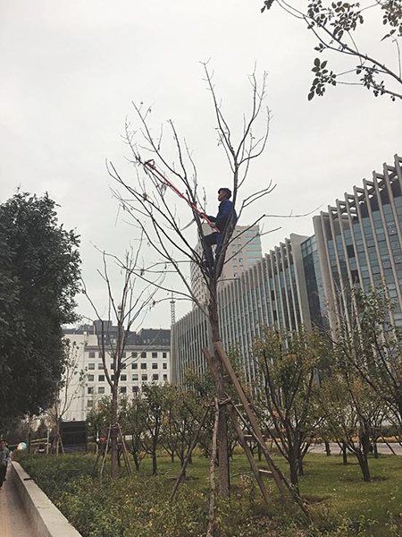 記者注意到,老段兩腳踩在樹枝上,手里的高枝剪和鋸子來回倒替使用,離他身子遠的樹枝有時連高枝剪都夠不著,可老段還是努力向前趴著要夠到,費力鉤住要剪掉的樹枝。一剪子剪不斷,他就繼續(xù)剪,看著多余的旁枝落在了地上,整個樹冠美觀了,就是老段心里最滿足的時刻。