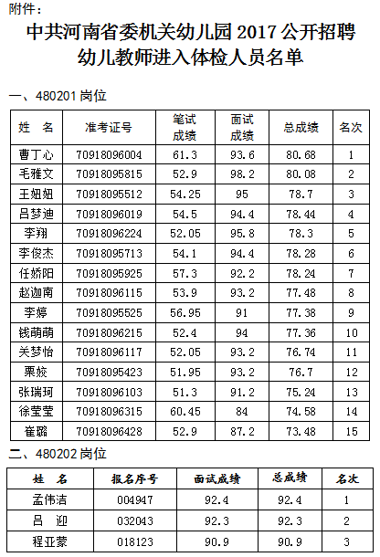 中共河南省委機關(guān)幼兒園2017年公開招聘幼兒教師面試工作已經(jīng)結(jié)束。根據(jù)總成績排名,按照招聘人數(shù)與體檢人數(shù)1:1的比例,確定480201崗位15名考生進(jìn)入體檢環(huán)節(jié),480202崗位3名考生進(jìn)入體檢環(huán)節(jié)。