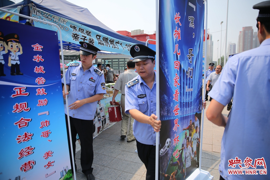 7月2日上午,鄭州市紫荊山地鐵站出入口,執(zhí)法人員抬著寫有勸導(dǎo)語的宣傳板,前往占道經(jīng)營攤位“圍觀執(zhí)法”