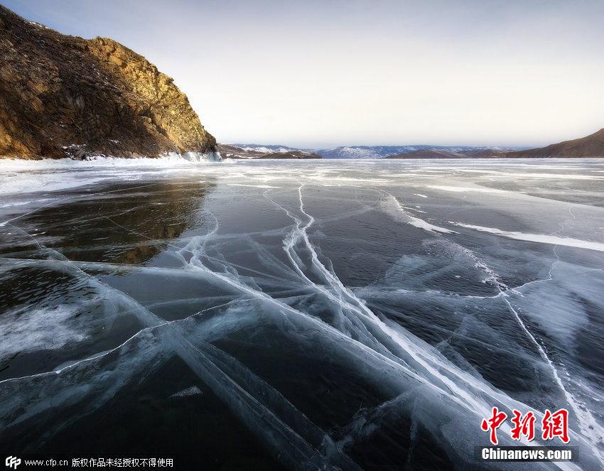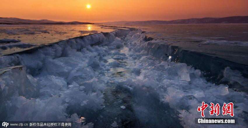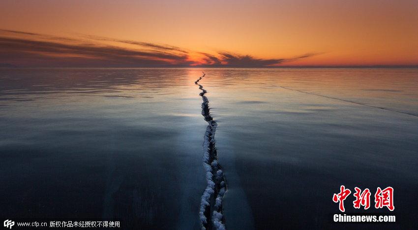 2015年4月1日消息,俄羅斯貝加爾湖面結(jié)冰,數(shù)百米長的裂縫仿佛將世界一分為二,夕陽的余暉灑在湖面上景色神奇迷人。