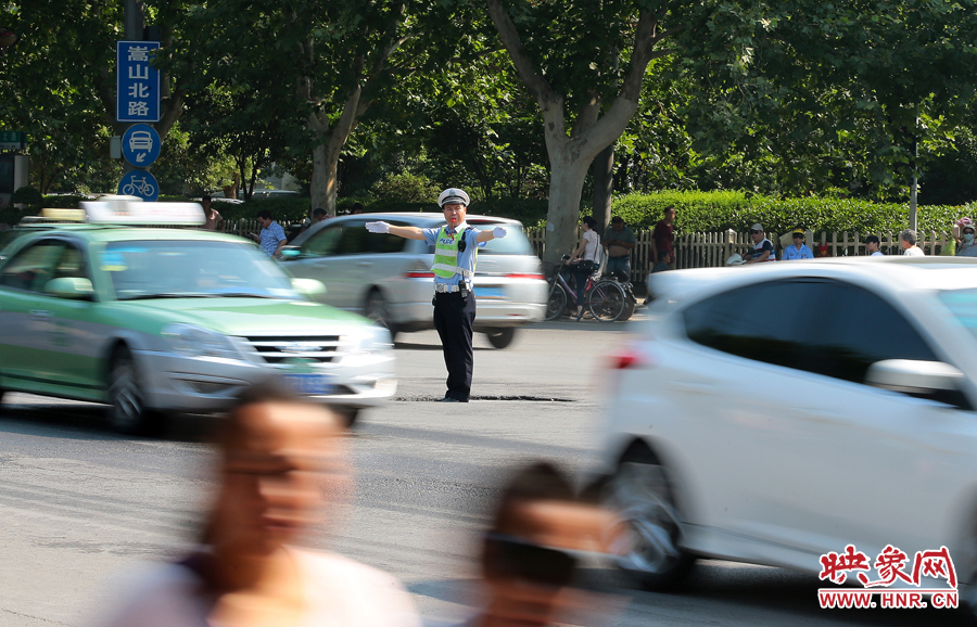 上午10點(diǎn),鄭州嵩山路與中原路交叉口,交警楊明昊在車流的熱浪中堅(jiān)守,他一天將近工作12個(gè)小時(shí)。