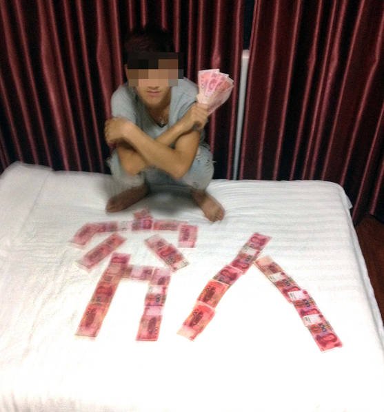 在小偷鄧某隨身帶的手機(jī)里,警察還意外發(fā)現(xiàn)了兩張照片,是一名男子和用100元人民幣擺成的“窮人”、“窮不”的字樣的合影。經(jīng)過民警詢問得知,照片上的男子是鄧某的老鄉(xiāng)唐某,這些錢是他第一次行竊的時候偷來的,總共有5100元。由于第一次一次性竊得這么多錢,兩人欣喜若狂,在居住的旅店內(nèi)把百元大鈔盡情的“秀”了一把。警方則根據(jù)照片上的線索順藤摸瓜,在廣東將唐某逮捕。