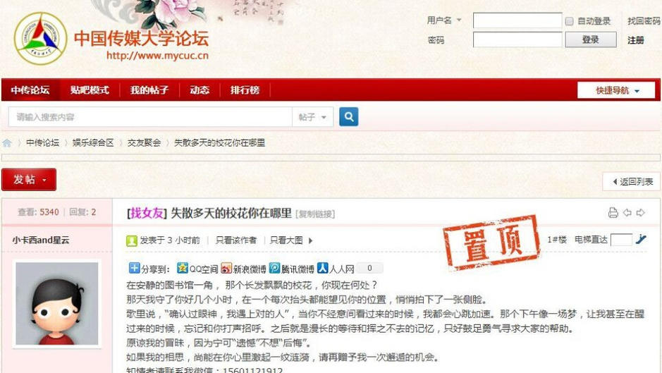 正值開(kāi)學(xué)季,中國(guó)傳媒大學(xué)驚現(xiàn)癡情男,張貼了數(shù)百?gòu)埡?bào)只為表白?;?,據(jù)照片顯示,海報(bào)中有女孩側(cè)臉照片,還留下男生的聯(lián)絡(luò)方式,甚是精細(xì)。