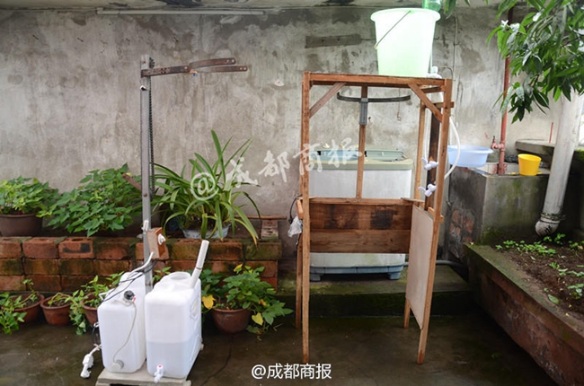 9月16日,四川樂山,陳攻科的父親正在使用自動洗頭機。38歲的樂山井研男子陳攻科在16年時間里,“玩”壞了18個頭盔,終于發(fā)明出了立式全自動按摩洗頭機,并獲得了國家實用新型專利。