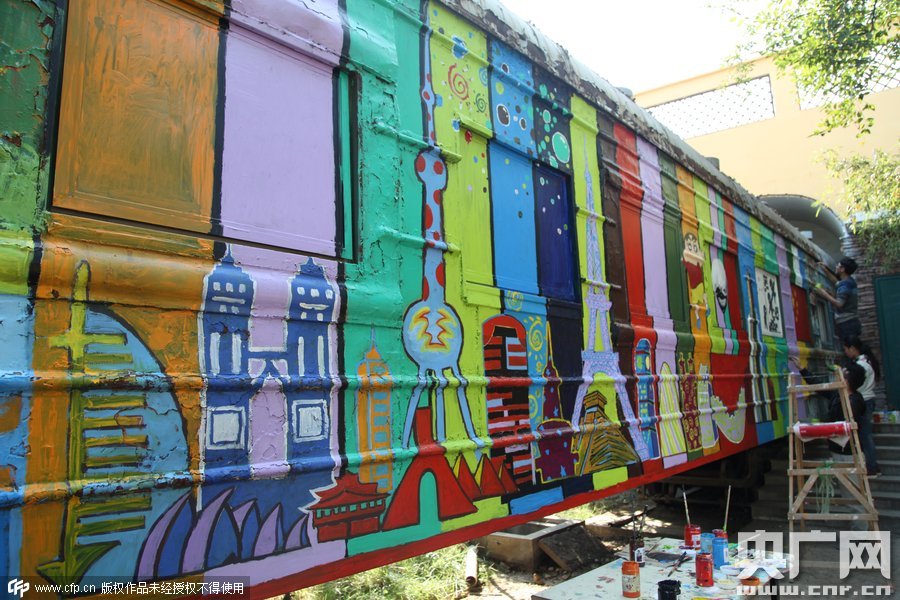 2015年10月10日,鄭州四禾美術中學充分發(fā)揮美術生的優(yōu)勢,對火車車身1進行涂鴉改造,使火車宿舍看起來更加漂亮。