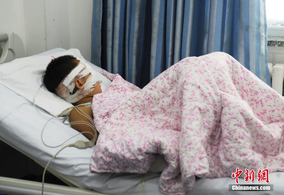 10月13日,12歲的朱某正在吉林大學(xué)第二醫(yī)院接受治療。據(jù)其家人介紹,10月11日,朱某獨(dú)自在家,遭同村村民王某挖出雙眼,行兇者還點(diǎn)燃了他家的房子,朱某靠裝死逃過(guò)一劫。王某事后自殺。目前雖經(jīng)手術(shù)治療,但朱某右眼視力已無(wú)恢復(fù)的可能,左眼亦不樂(lè)觀。警方正對(duì)此案進(jìn)行調(diào)查。中新社記者 張瑤 攝