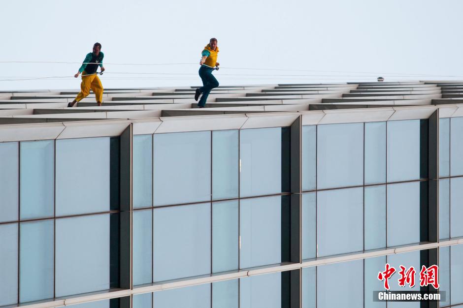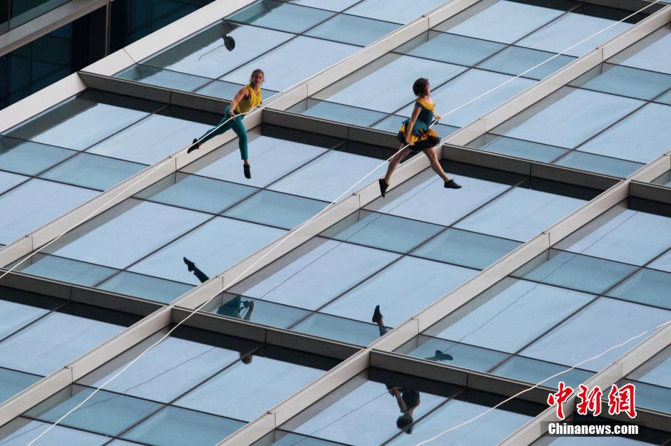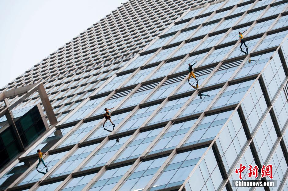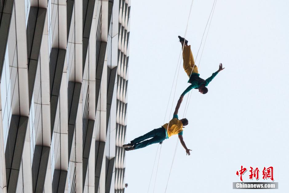 10月15日,美國(guó)BANDALOOP高空舞蹈團(tuán)“空中芭蕾”中國(guó)內(nèi)地首秀空降上海街頭,4名高空舞者在80米高的玻璃幕墻上翩翩起舞,舞蹈之美和力量之美在云端融合。中新社記者 張亨偉 攝