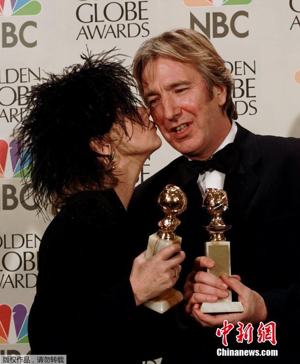 圖為1997年1月19日,阿倫·瑞克曼(Alan Rickman)獲得第54屆金球獎時接受女演員海倫·米倫(Helen Mirren)的祝賀。