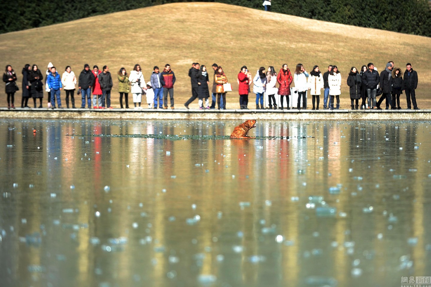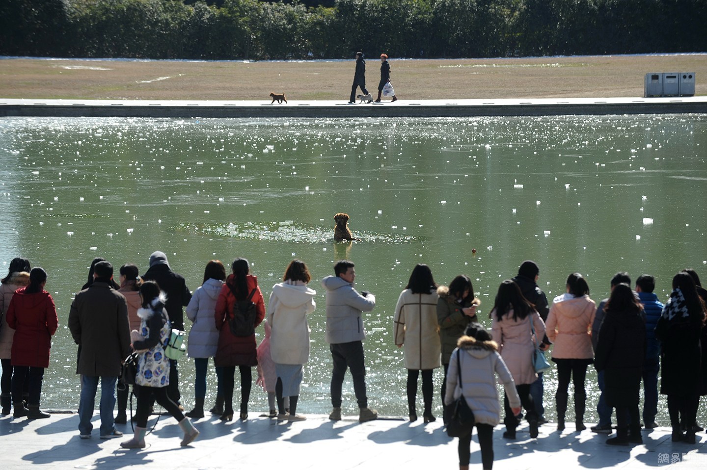 “狗狗主人一直告訴它要用力?!表椣壬f大金毛雖然奮力掙扎,卻無濟于事,越掙扎陷得越深,體力也消耗了不少。一旁的狗主人很是著急,決定下水救它,無奈女同志體力有限,基本破不了冰。不忍看著一個生命就這樣消失。圖為眾人圍觀被困冰窟的金毛。