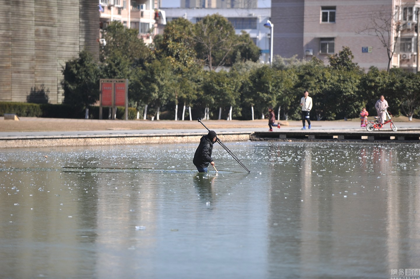 項先生當(dāng)即放下手中的活,拿起拍攝使用的三腳架,直接走進冰冷的湖水,敲碎河面上的冰,朝狗狗走去。最后金毛犬獲救。圖為項先生用三腳架破冰下水救金毛。