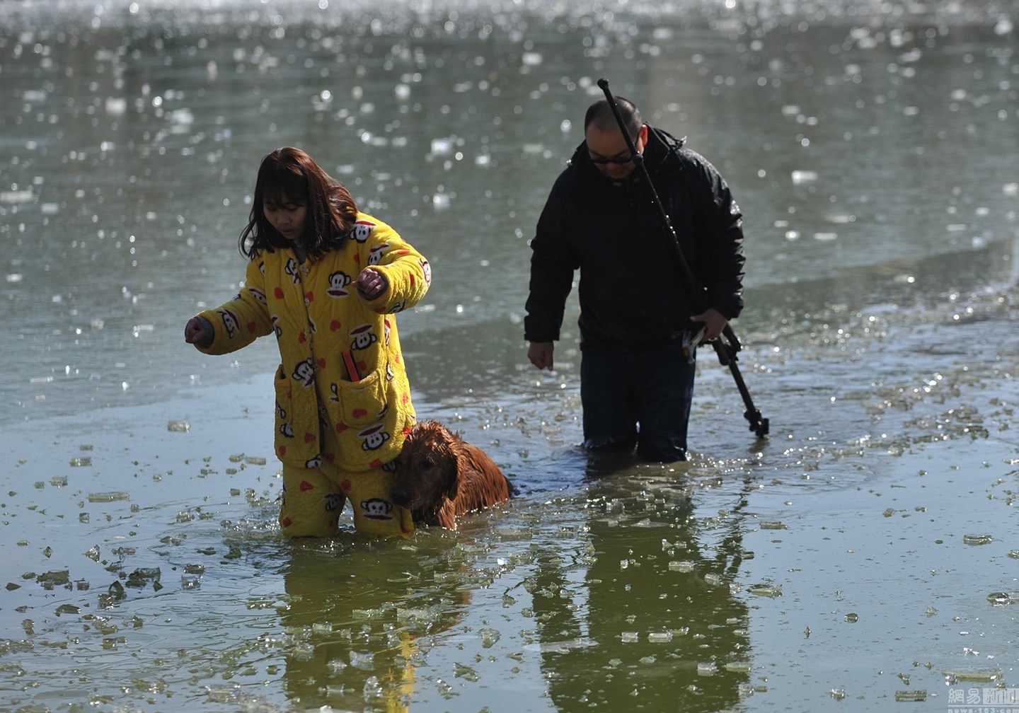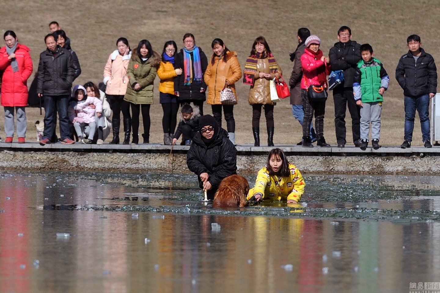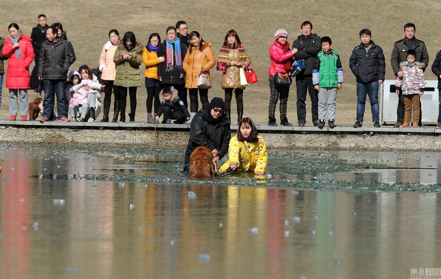 “我知道這水不深,自己又會游泳。”面對冰冷的水面,項先生并沒有多想,只想趕緊救出狗狗。圖為兩人合力救金毛現(xiàn)場。