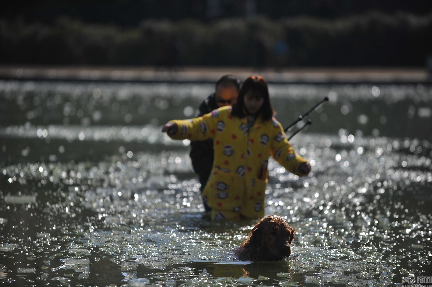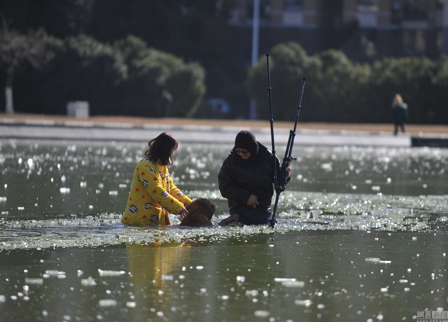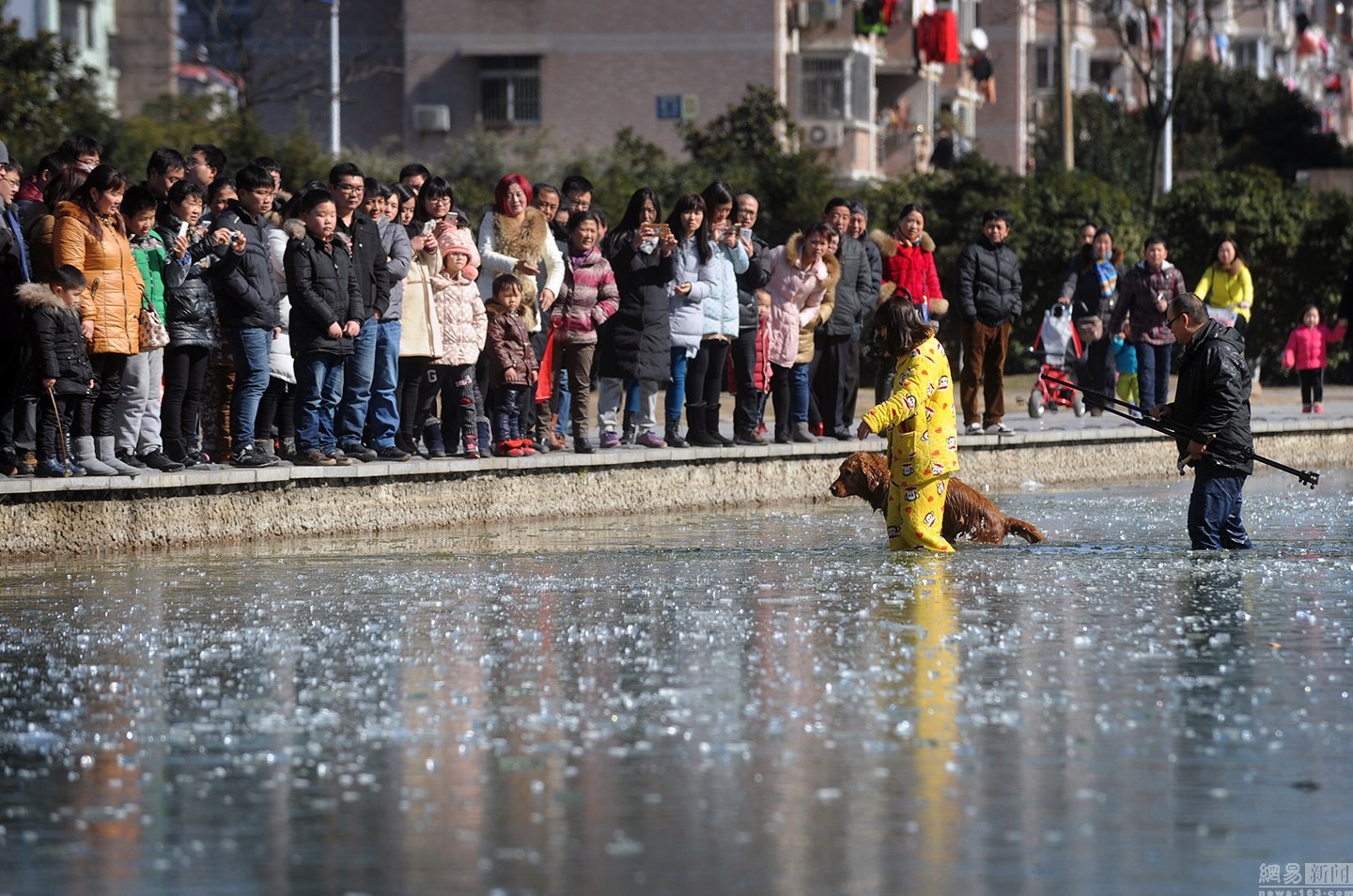 “我知道這水不深,自己又會游泳。”面對冰冷的水面,項先生并沒有多想,只想趕緊救出狗狗。圖為兩人合力救金毛現(xiàn)場。