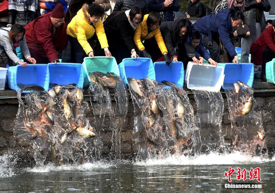2016年2月22日,山東省濟(jì)南市,眾多市民來到大明湖南岸,以每斤4.5元的價格購買鯉魚和鯽魚,集體將魚兒放生到大明湖,千余尾魚兒同時傾倒在湖中,場面頗為壯觀。