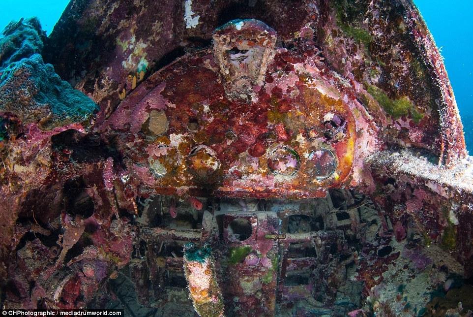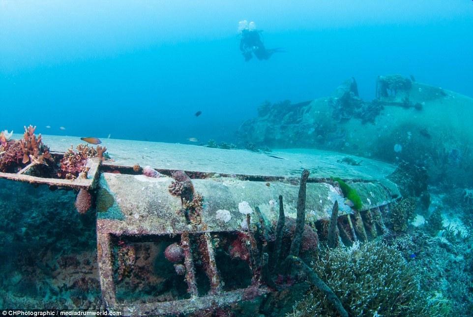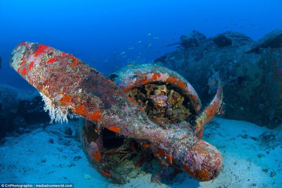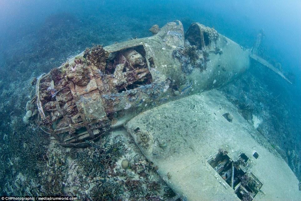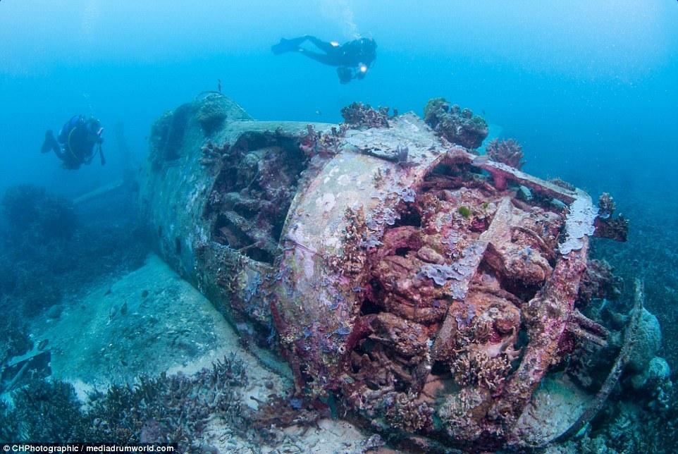 這些曾經(jīng)參與世界大戰(zhàn)的戰(zhàn)斗機(jī)如今安靜的躺在所羅門(mén)群島大海185英尺(約56米)的淺層海床上。今夕形成了鮮明的對(duì)比,英勇的美國(guó)F6F地獄貓戰(zhàn)斗機(jī)上覆蓋了大量的珊瑚。