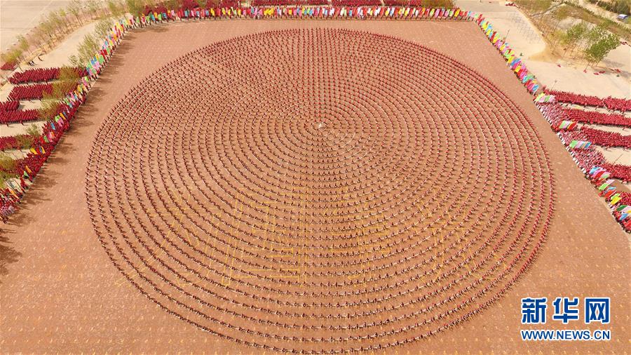 4月7日,在河南登封少林塔溝武術(shù)學(xué)校練功場(chǎng),上課間操的學(xué)員擺出圓形圖案。當(dāng)日,河南登封少林塔溝武術(shù)學(xué)校2016年“春訓(xùn)”拉開帷幕,2.6萬名學(xué)員同上陣,進(jìn)行隊(duì)形變換、十八般兵器、少林硬氣功、少林集體棍等多種功法演練?!按河?xùn)”是少林塔溝武術(shù)學(xué)校每年春季開展的一項(xiàng)強(qiáng)化訓(xùn)練活動(dòng),旨在提升學(xué)員的耐力和競(jìng)技狀態(tài)。新華社發(fā)(牛書培 攝)