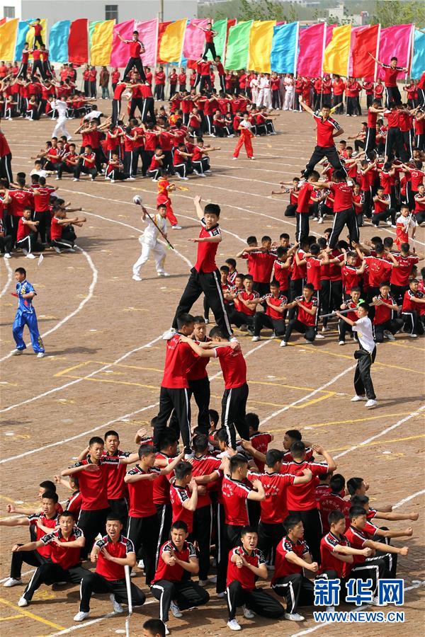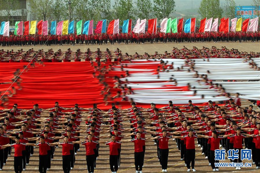 4月7日,在河南登封少林塔溝武術(shù)學(xué)校練功場(chǎng),上課間操的學(xué)員疊起人塔。當(dāng)日,河南登封少林塔溝武術(shù)學(xué)校2016年“春訓(xùn)”拉開帷幕,2.6萬名學(xué)員同上陣,進(jìn)行隊(duì)形變換、十八般兵器、少林硬氣功、少林集體棍等多種功法演練?!按河?xùn)”是少林塔溝武術(shù)學(xué)校每年春季開展的一項(xiàng)強(qiáng)化訓(xùn)練活動(dòng),旨在提升學(xué)員的耐力和競(jìng)技狀態(tài)。新華社發(fā)(牛書培 攝)