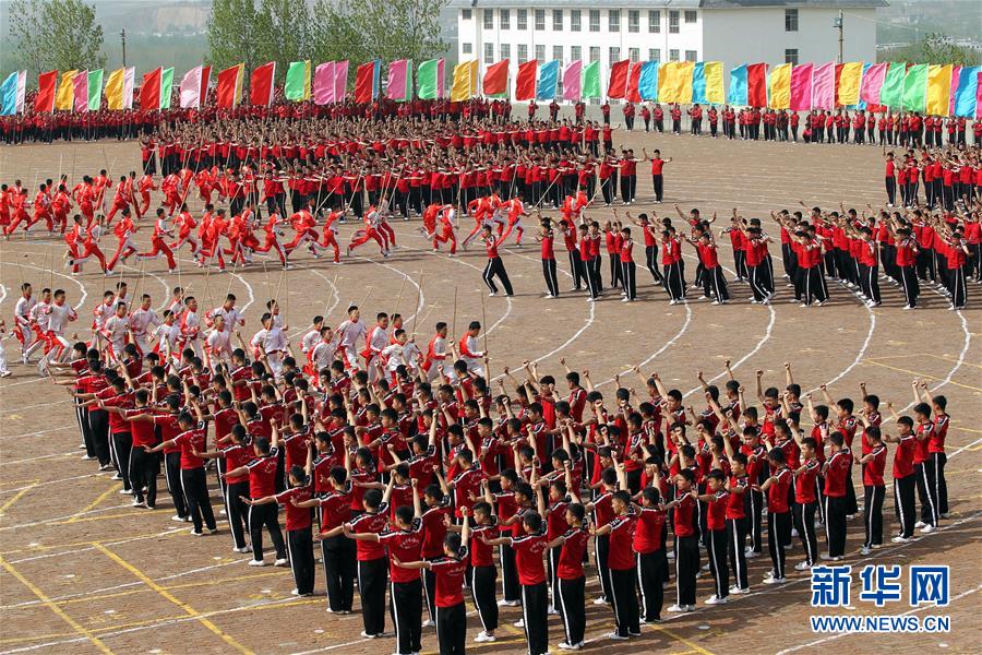 4月7日,在河南登封少林塔溝武術(shù)學(xué)校練功場(chǎng),上課間操的學(xué)員進(jìn)行隊(duì)形變換。當(dāng)日,河南登封少林塔溝武術(shù)學(xué)校2016年“春訓(xùn)”拉開帷幕,2.6萬名學(xué)員同上陣,進(jìn)行隊(duì)形變換、十八般兵器、少林硬氣功、少林集體棍等多種功法演練?!按河?xùn)”是少林塔溝武術(shù)學(xué)校每年春季開展的一項(xiàng)強(qiáng)化訓(xùn)練活動(dòng),旨在提升學(xué)員的耐力和競(jìng)技狀態(tài)。新華社發(fā)(牛書培 攝)