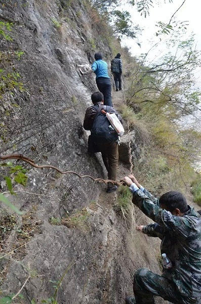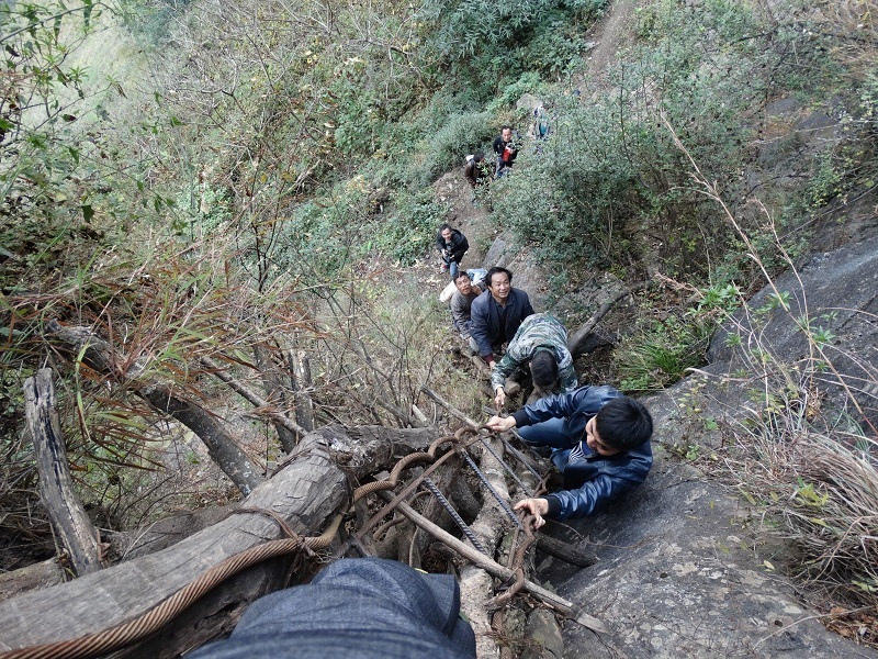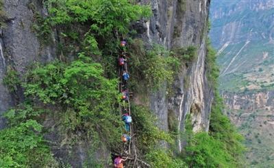 15個(gè)孩子中多數(shù)是女孩,在三個(gè)家長(zhǎng)的保護(hù)下,背著沉沉的書(shū)包,大約用了2個(gè)小時(shí),到達(dá)“懸崖村”。村里通向外界,需要順著懸崖斷續(xù)攀爬17條藤梯,其中接近村莊的幾乎垂直的兩條相連的藤梯長(zhǎng)度約100米,沒(méi)有藤梯的崖壁才是最危險(xiǎn)的。據(jù)支爾莫鄉(xiāng)黨委書(shū)記阿皮幾體講,他知道的在這條路上摔死的人有七八個(gè),有村里的人,也有外來(lái)的人,而摔傷的人更多。