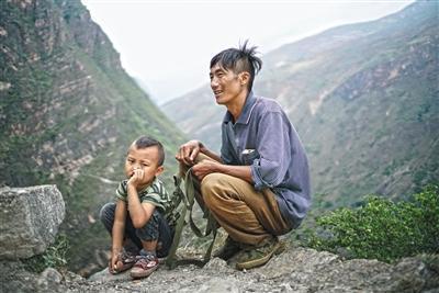 圖為5月14日,在三名家長(zhǎng)的保護(hù)下,15個(gè)孩子從勒爾小學(xué)出發(fā),走崖壁,爬藤梯,踏上回家的路。4月27日,阿土勒爾村的一個(gè)村民摔下了懸崖,村子里的大人對(duì)在山下讀書(shū)的孩子更加擔(dān)心起來(lái)。阿土勒爾村有15個(gè)6至15歲的孩子在山腳下的勒爾小學(xué)上學(xué),平時(shí)住校,每月月中和月底的周末才回家。每次上下山,家長(zhǎng)們都會(huì)輪流接送。5月14日是家長(zhǎng)接孩子的日子,清晨6點(diǎn)多,30多歲的陳古吉帶著背包繩和另外兩個(gè)家長(zhǎng)一起下山接孩子。村里身手敏捷的年輕人,下山通常需要1小時(shí),上山大約90分鐘,對(duì)于外來(lái)的人,通常是這個(gè)時(shí)間的兩倍。