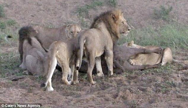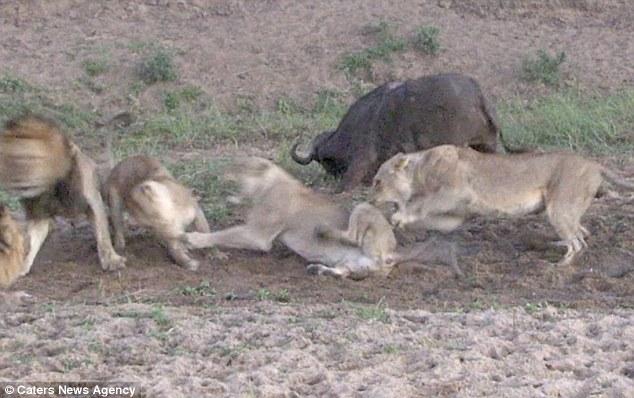 突然,兩群獅子開始內(nèi)訌,一只母獅子攻擊了一只不屬于自己群體的公獅子,試圖阻止它享用水牛。