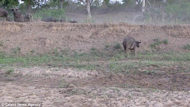 此時,機(jī)智的水牛趁獅子來不及注意,偷偷地站了起來。