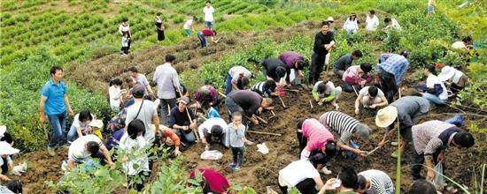 昨天,記者驅(qū)車來到了這個幾乎是磐安縣最東面的偏遠鄉(xiāng)鎮(zhèn)胡宅,事實上,后張村就處于磐安和新昌交界的地方。中午時候,這個人口上千的村落幾乎已經(jīng)被各種各樣的車子停滿了,有奔馳越野車,也有面包車和電瓶車,有浙G、浙D、浙A等省內(nèi)牌照的,也有皖N的。這里的山頭傳說是死火山形成,所以土壤肥沃,幾乎整塊都被犁出來,種上莊稼,最多的是茶樹。一眼望去,尋寶的人員估計有六七百人,有人在挖,也有人是在圍觀。村民說,來來回回,當(dāng)天起碼涌進來上千人在尋寶。