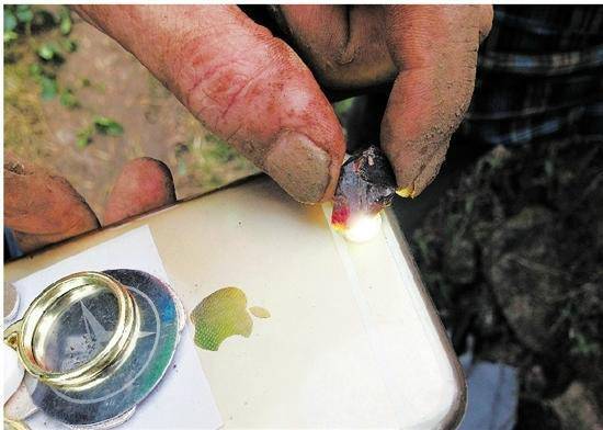 記者在現(xiàn)場看到,有人挖出五六顆還沒有指甲片大的小石頭,在手機燈下照了照,就被一女子以400元的價格買走。47歲的潘熙浩是磐安縣尖山鎮(zhèn)烏石村人,他是早上10點來的,兩三個小時的時間里,找到了兩顆指甲蓋大的石頭。