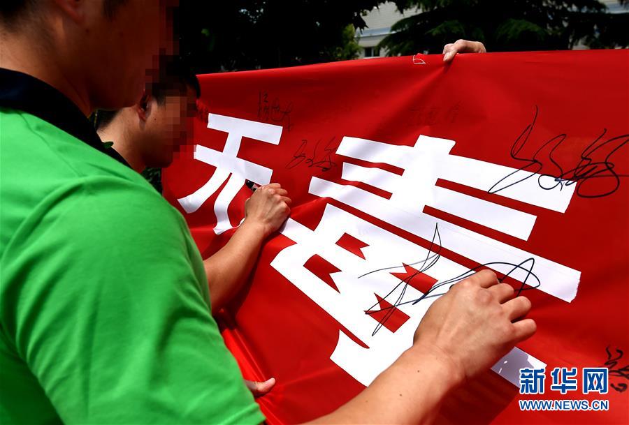 6月22日,河南省未成年人強制隔離戒毒所內的戒毒人員在“無毒青春健康生活”條幅上簽名。新華社記者 李安 攝